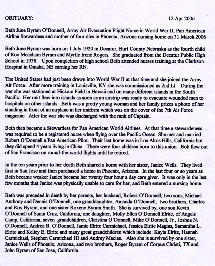 Information taken from 50th class reunion booklet, May 1988 Beth (Byram) O’Donnell: Sunnyvale, CA. Husband-Robert A. (Pan Am pilot). Children-Michael, Kevin, Molly & Dennis. Six grandchildren & 2 on the way. I served in WWII area evacuation nurse in the South Pacific. We were called Hell’s Angels but were the first M.A.S.H. I was a Capt in the Army 7th Air Force. After the war I went to design school. I was a stewardess prior to marriage. I have lived in Hong Kong. I had nurses training at Clarkson Hospital in Omaha. I am presently a nurse for the State of CA. I like gardening & sewing. ~~~~~~~~~~~~~~~~~~~~~~~~~~~~~~~~~~~~~~~~~~ |