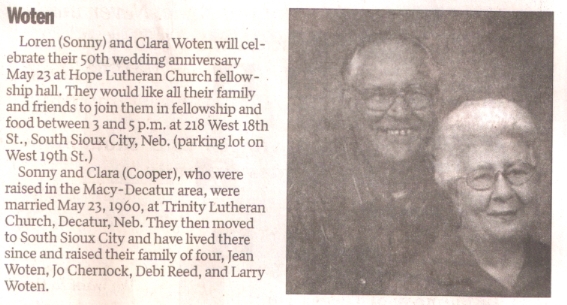 (Information taken from 50h Alumni Banquet Booklet May 2005. You may send updated information to webmaster at any time) Spouse: Loren (Sonny) Children: 4 Jean, Jo, Debra and Larry Grandchildren: 4 Tyler, Lindsay, Samuel and Duane Since graduating in 1955, I attended one year at Dana College and two summers at Wayne State, and taught country schools around Decatur for four years before marrying in 1960 and moving to South Sioux. I have had many part time jobs--sitting with patients in hospitals and their homes, election board, office work, ironing and selling Avon products, besides working as a church secretary for 28 years. With four children, I tried to work while they were in school. Sonny worked as a glazier in Sioux City and South Sioux ships for about 30 years. We both have been involved in all activities at church as well as coaching baseball, softball and basketball. I've headed up our music department at church for years and direct choir and organized a country/Gospel service for which we play once a month. We've also run a country jam session at the local Senior Center every Friday night for about 20 years now and entertain at many nursing homes. We've really had a fun time with our country band, though; playing for dances and parties in about a 100 mile radius. It's been a learning experience, since we do a lot of different types of music. Our Granddaughter has sung with us and one Grandson, Sam, is a good drummer and has played with us. We're also lucky to have a very talented friend who helped us produce 3 CD's so our Grandchildren will be able to show their kids what our music was like. Son, Larry, thinks it's neat to be the only guy around whose folks have a CD out! Iit's a busy life--but it's been GREAT!